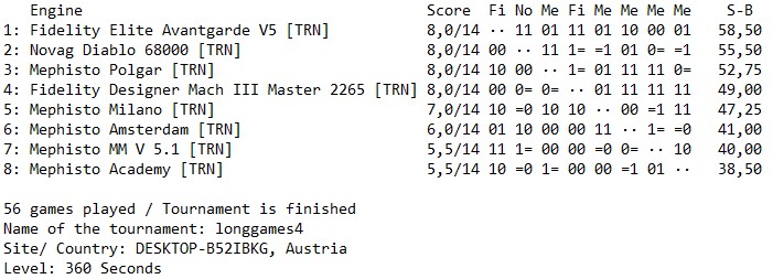Ce qui est intéressant, est que si on fait jouer les 4 premières machines entre elles au niveau tournoi sur un nombre assez grand de parties, ce classement s’inverse, le Polgar étant l’adversaire attitré du MachIII qu’il écrabouille littéralement: